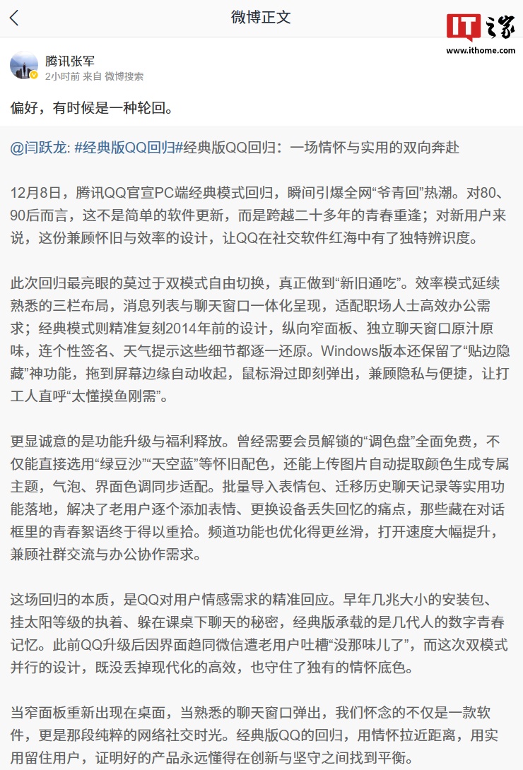 注意到,腾讯公司公关总监张军今日发文回应了经典版 QQ 的回归:“偏好,有时候是一种轮回。”